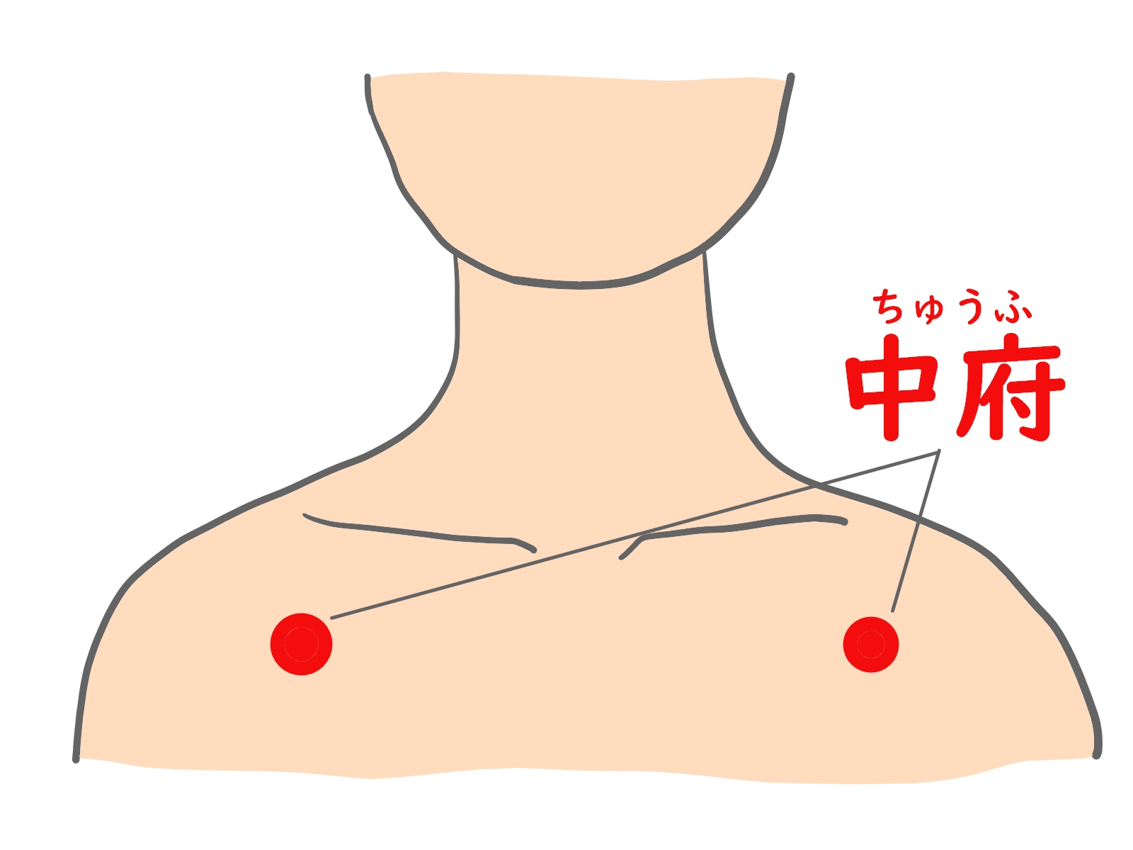 中府(ちゅうふ)のツボの位置は、腕の付け根と鎖骨の外側の端と胸に囲まれた、くぼんだところに位置します。