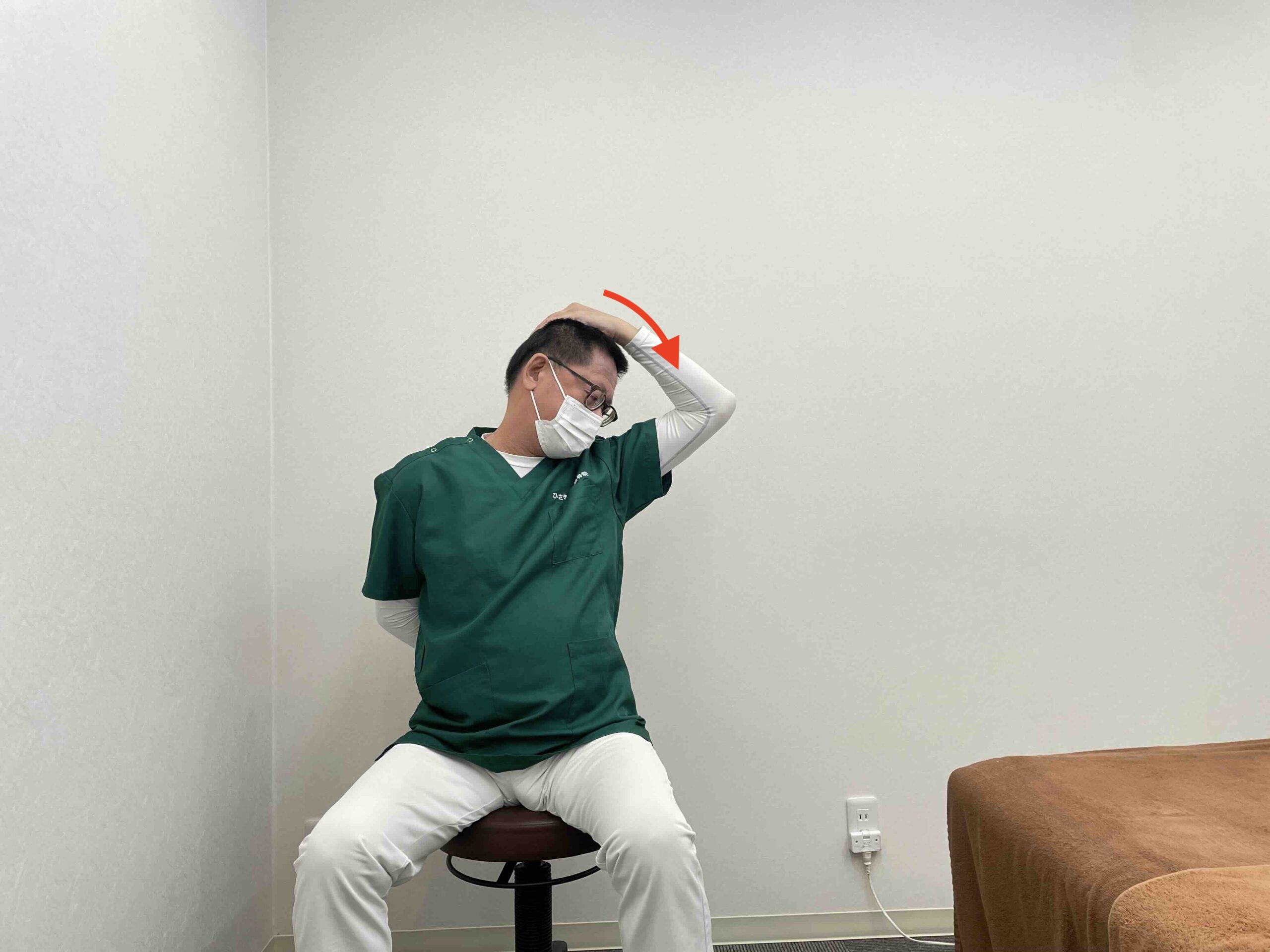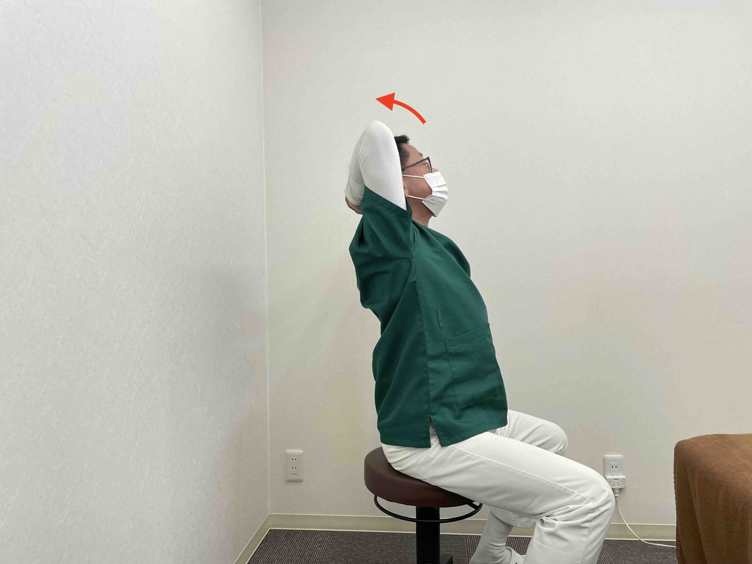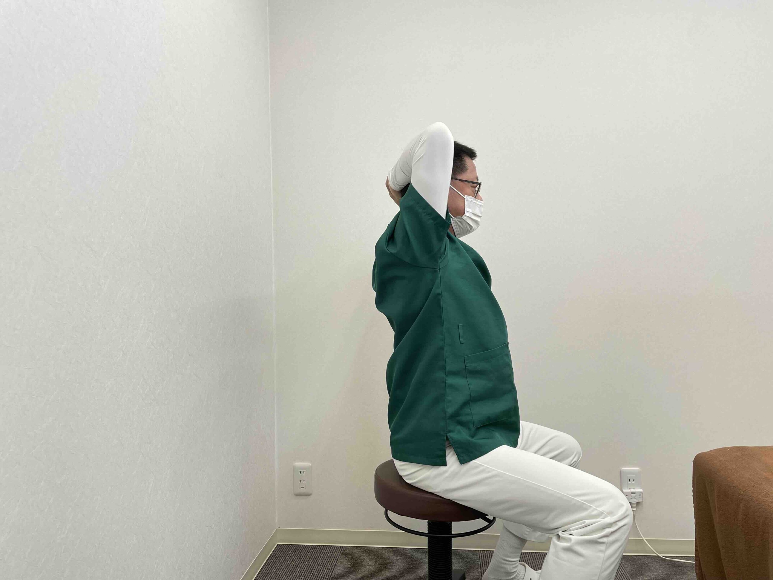 イスに座って、背筋を伸ばし顔を左に向け、右腕を上げて肘を曲げ、後頭部に当て、左手で右手首をつかみます。