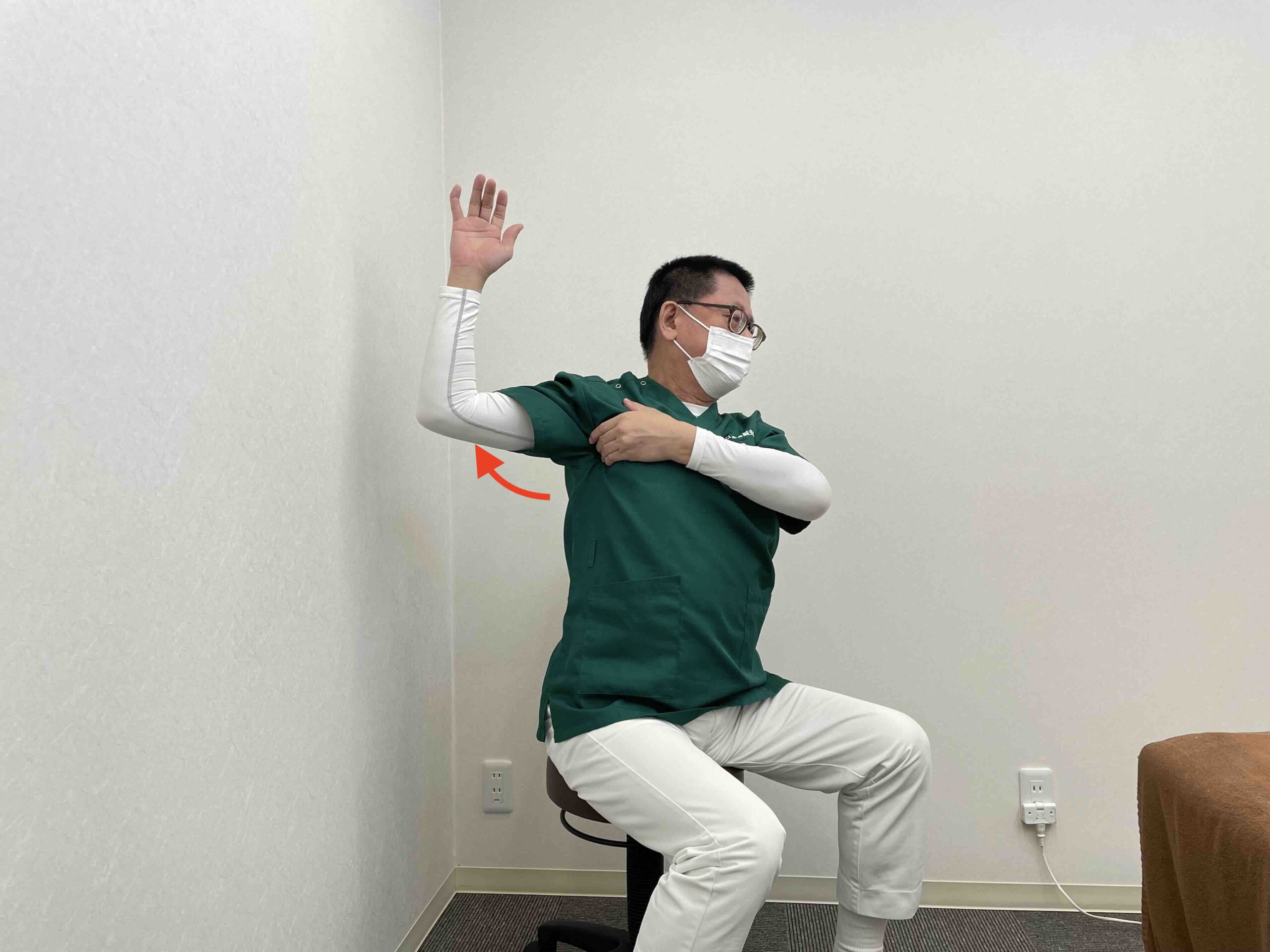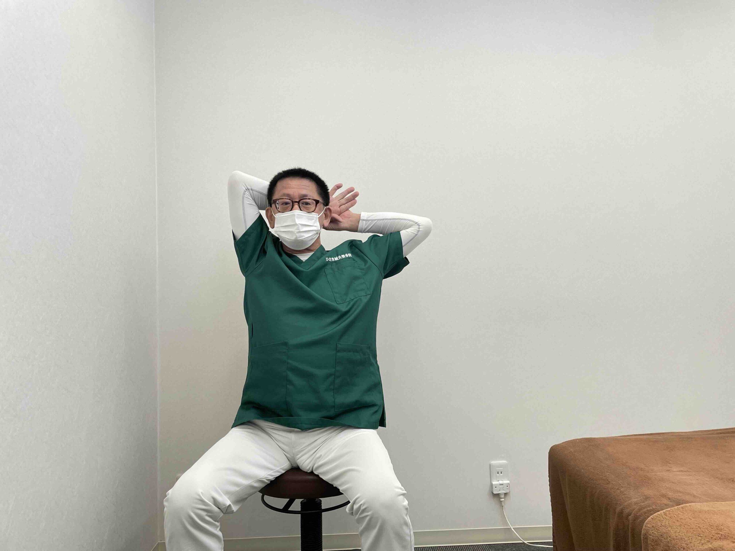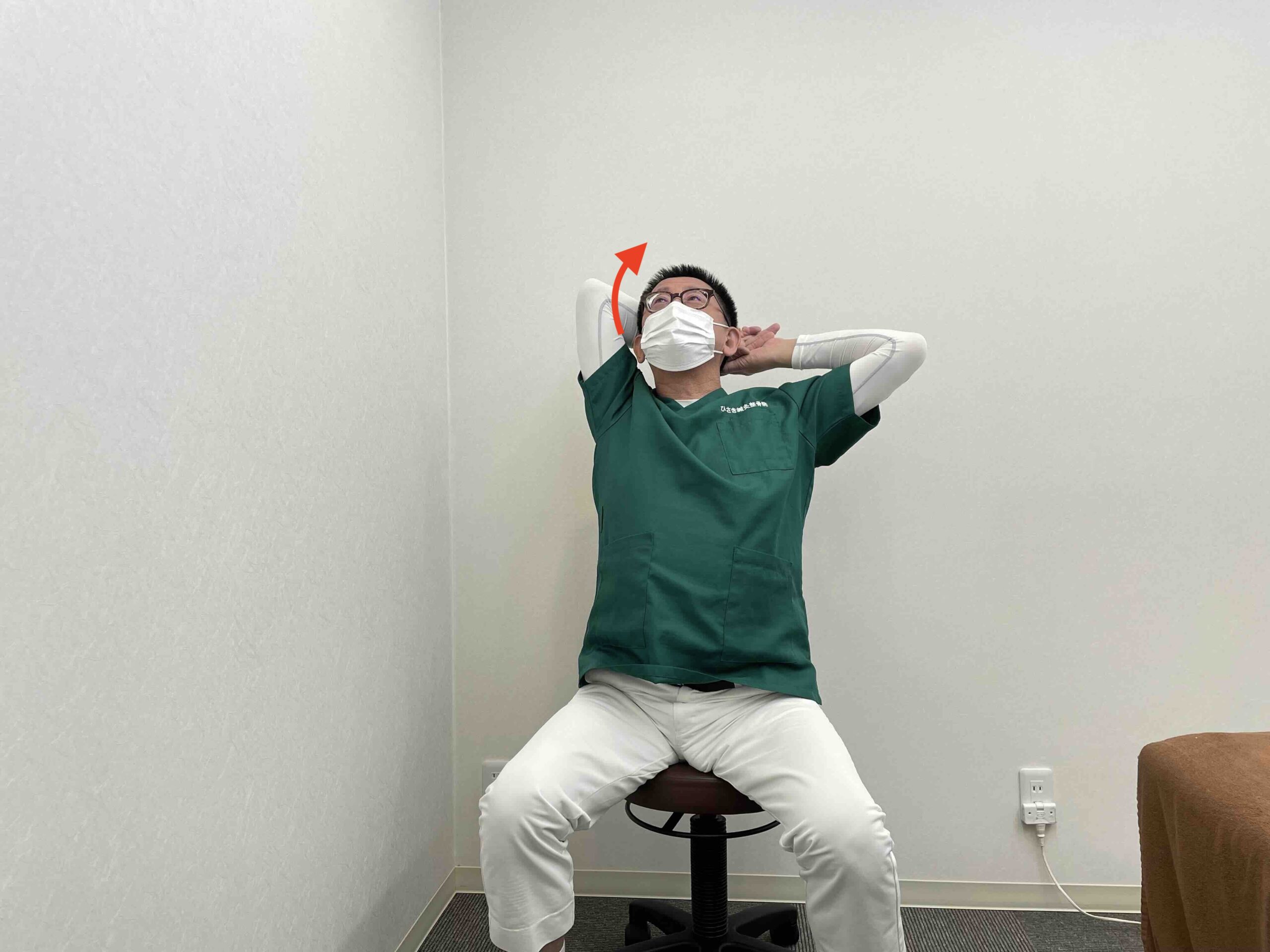イスに座って、背筋を伸ばし顔を左に向け、右腕を上げて肘を曲げ、後頭部に当て、左手で右手首をつかみます。