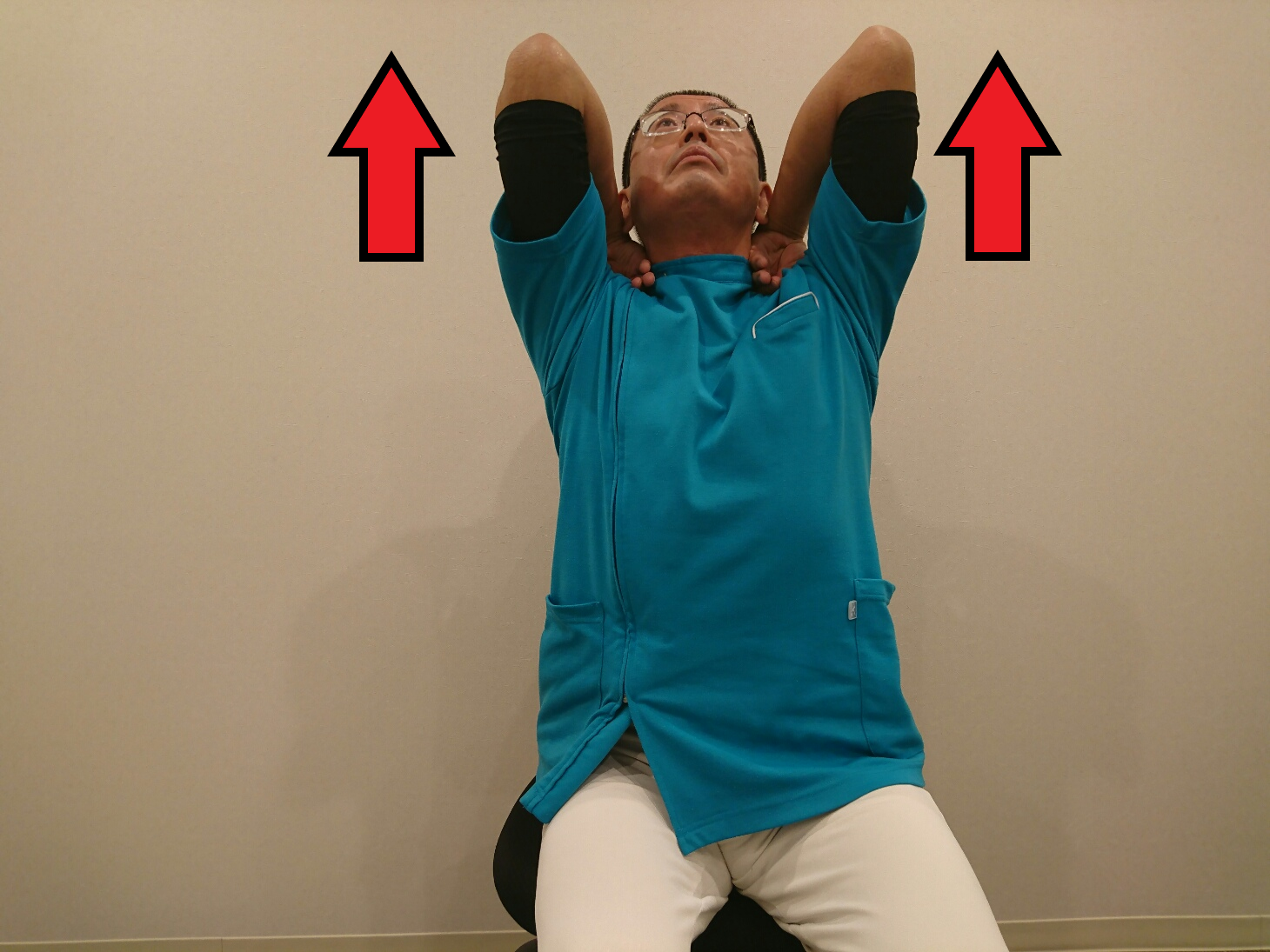 背筋を伸ばして椅子に座り、顔を上に向けて、脇を開いて手を胸に当てます。