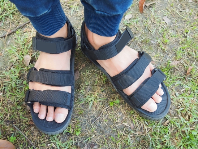 サンダルを使用すると、ヒモ靴のデメリットは解消されますが、ヒモ靴ほど足を固定することが難しい履物です。