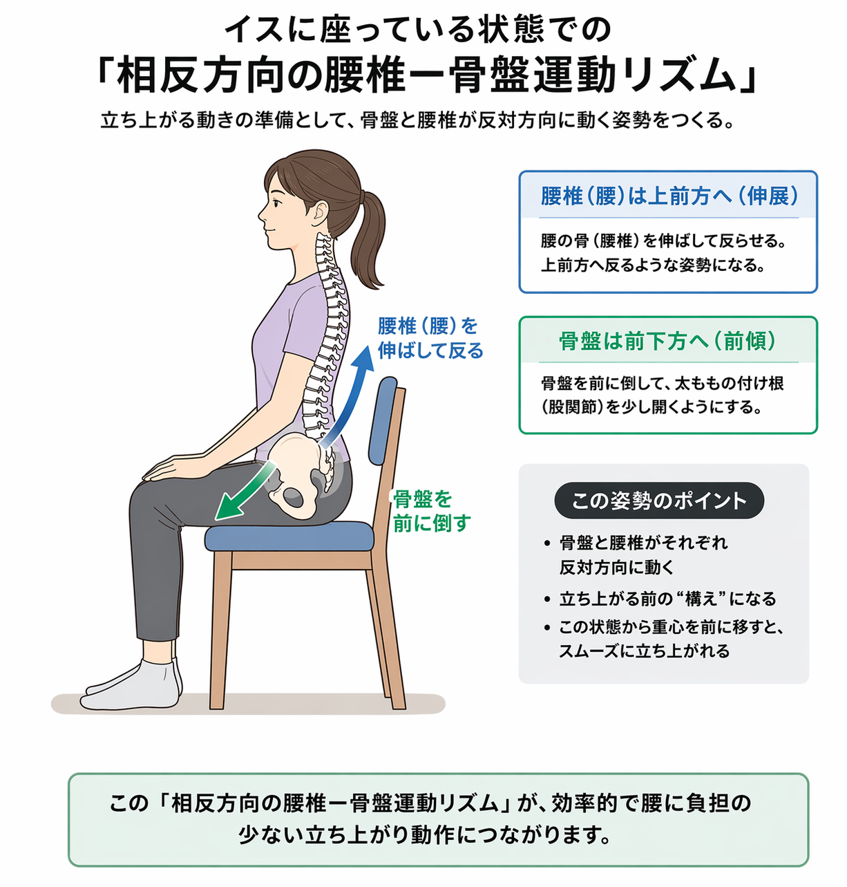 この理想的な一連の立ち上がり動作を、「相反方向の腰椎ー骨盤運動リズム」と呼びます。