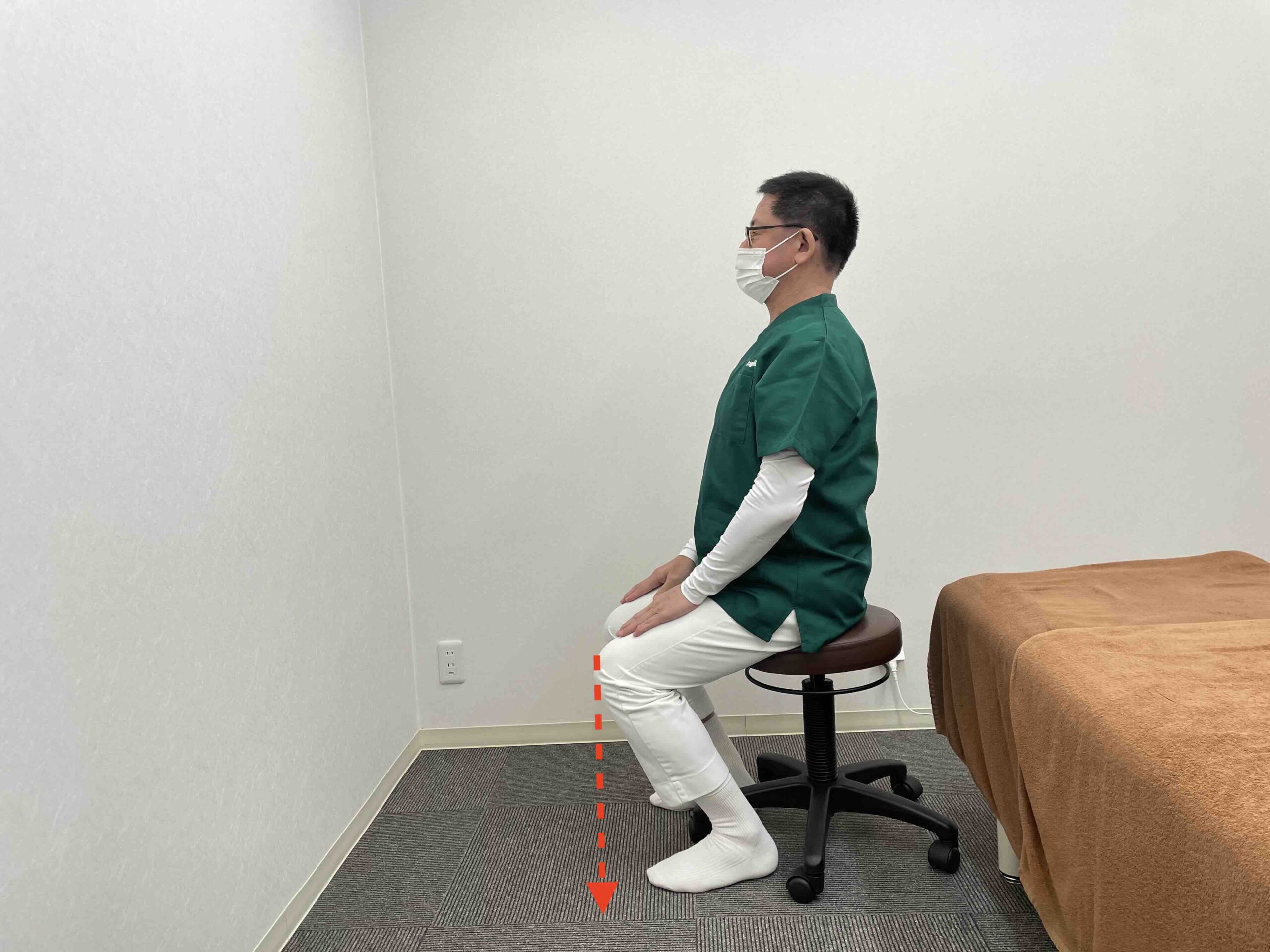背筋を伸ばして、肩幅に足を広げて、足裏をしっかり地面につけ、足先はひざから出ないようにして、イスに浅く腰掛けます。