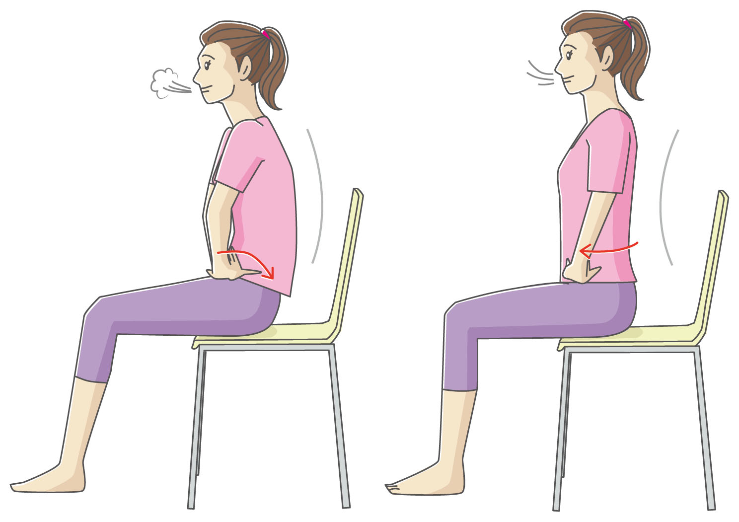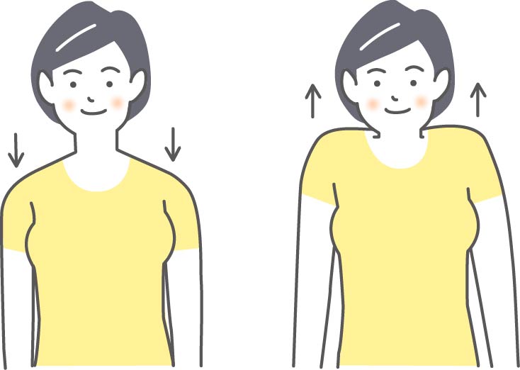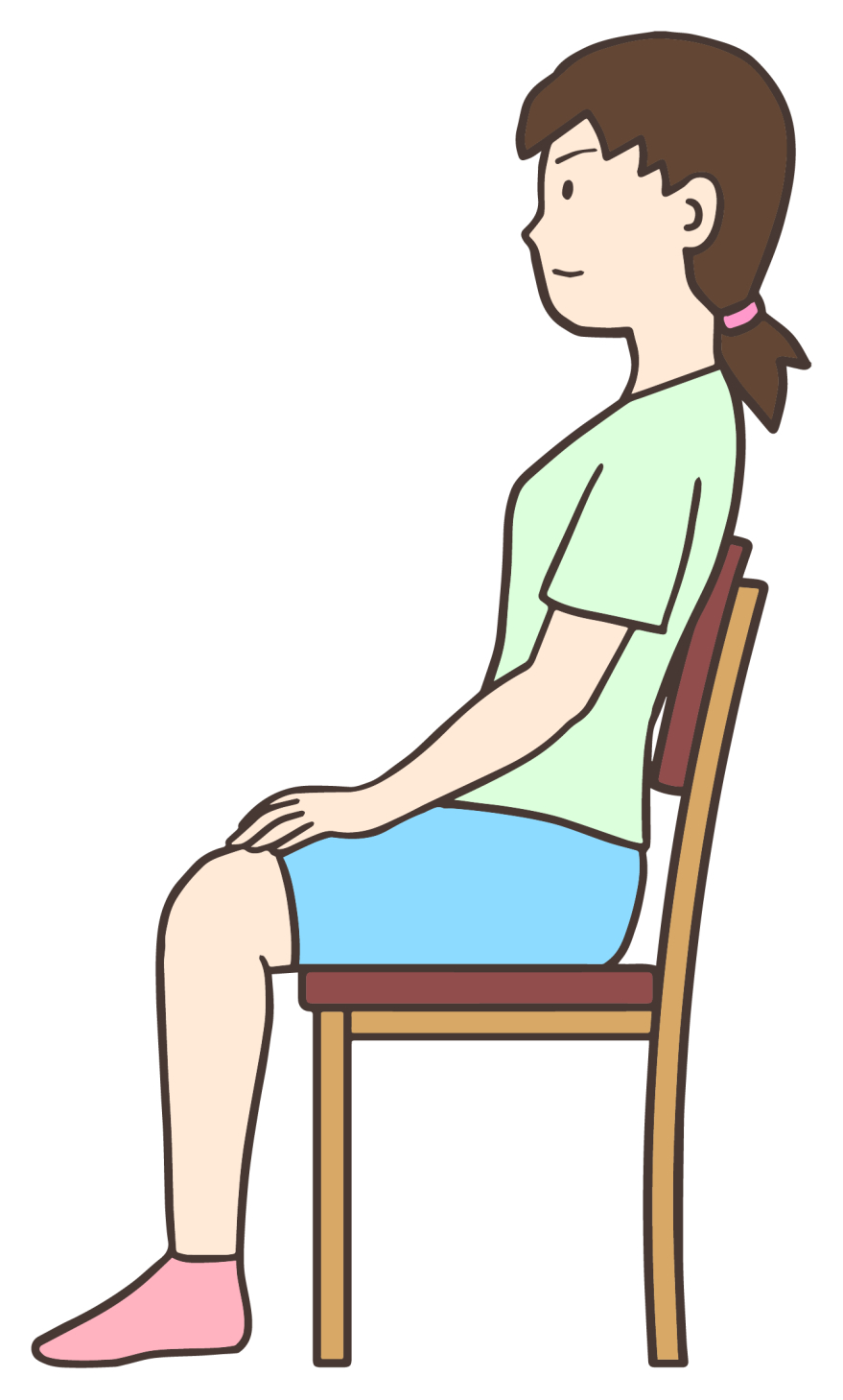 1) まっすぐに立つか、イスに深く腰かけます。