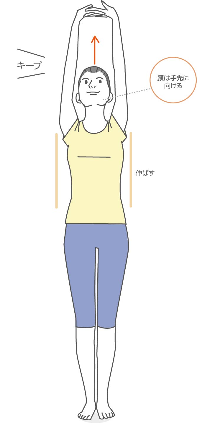 1) 立った状態で、両手を頭上に伸ばします。