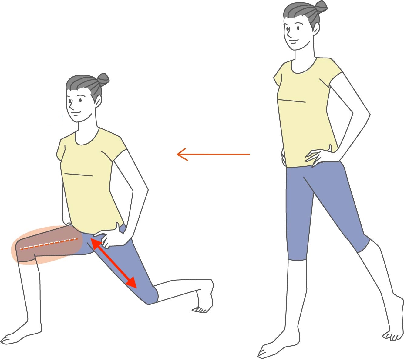 両足を肩幅に開いて立ってください。片方の足を大きく前に出してひざを曲げ、後ろ足は伸ばして、体を下に沈めて腰を前に押し出すようにしてください。