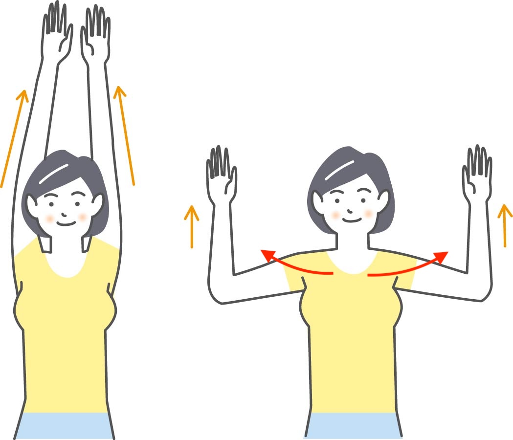 その後、手のひらを前面に向けたまま、腕を上方に上げて、おなかを伸ばすように、背伸びをして、この姿勢を、20秒間、キープしてください。