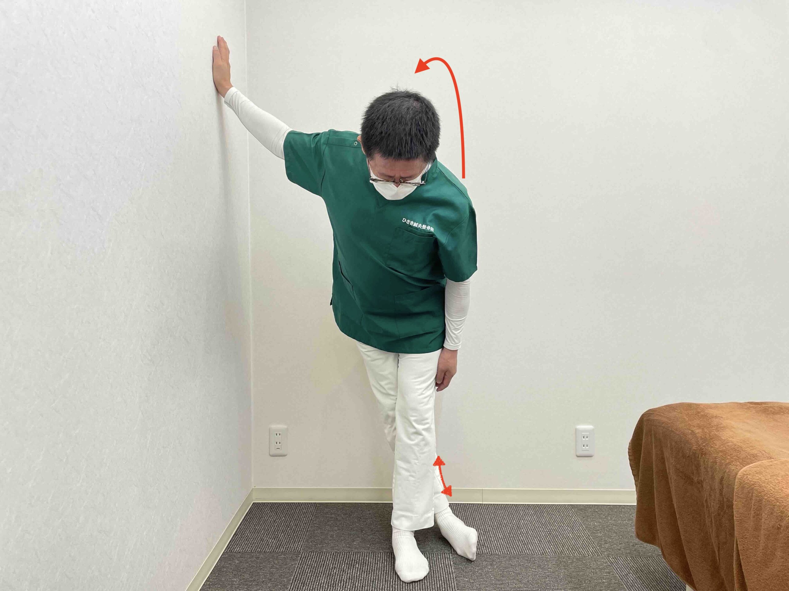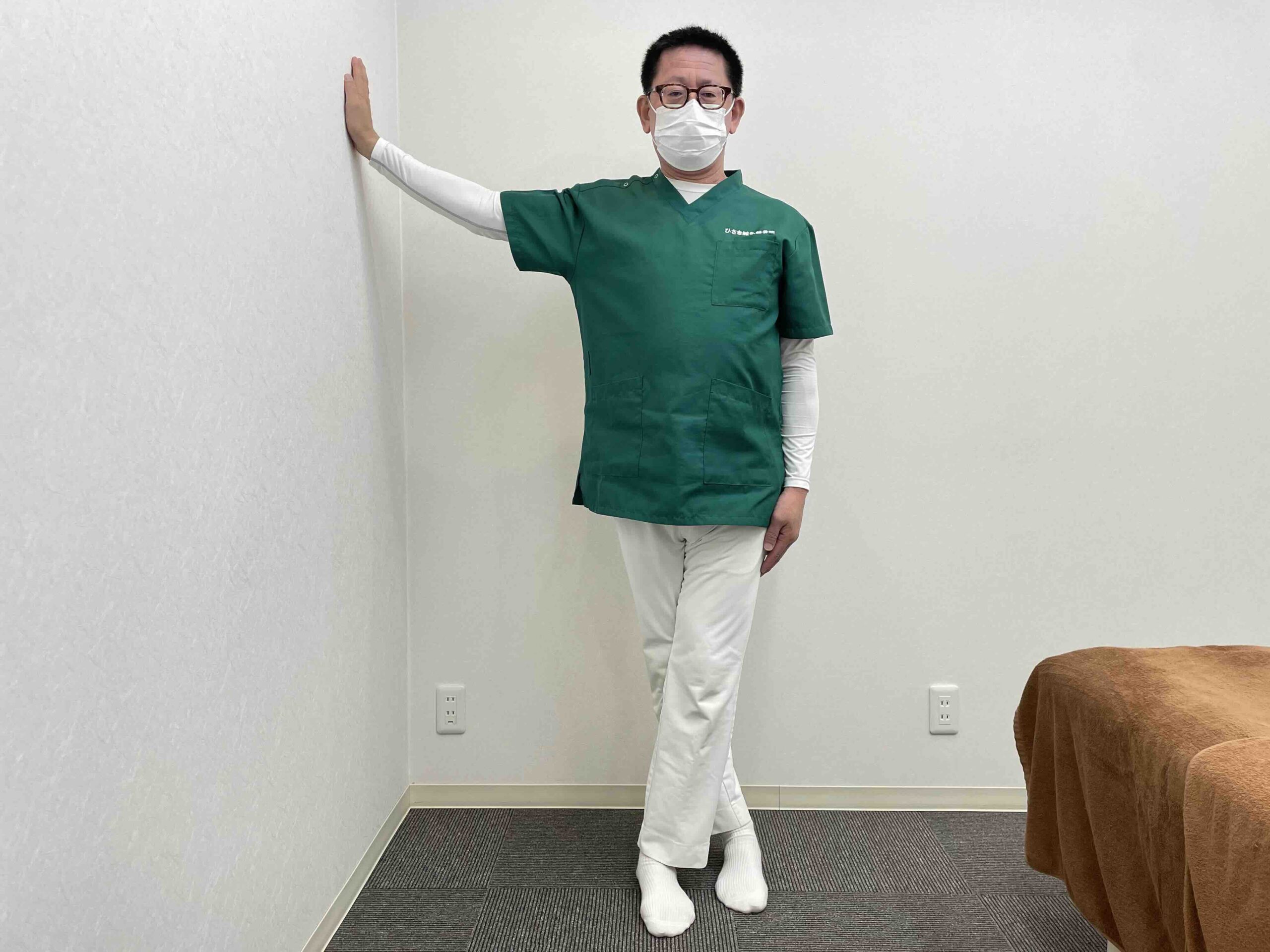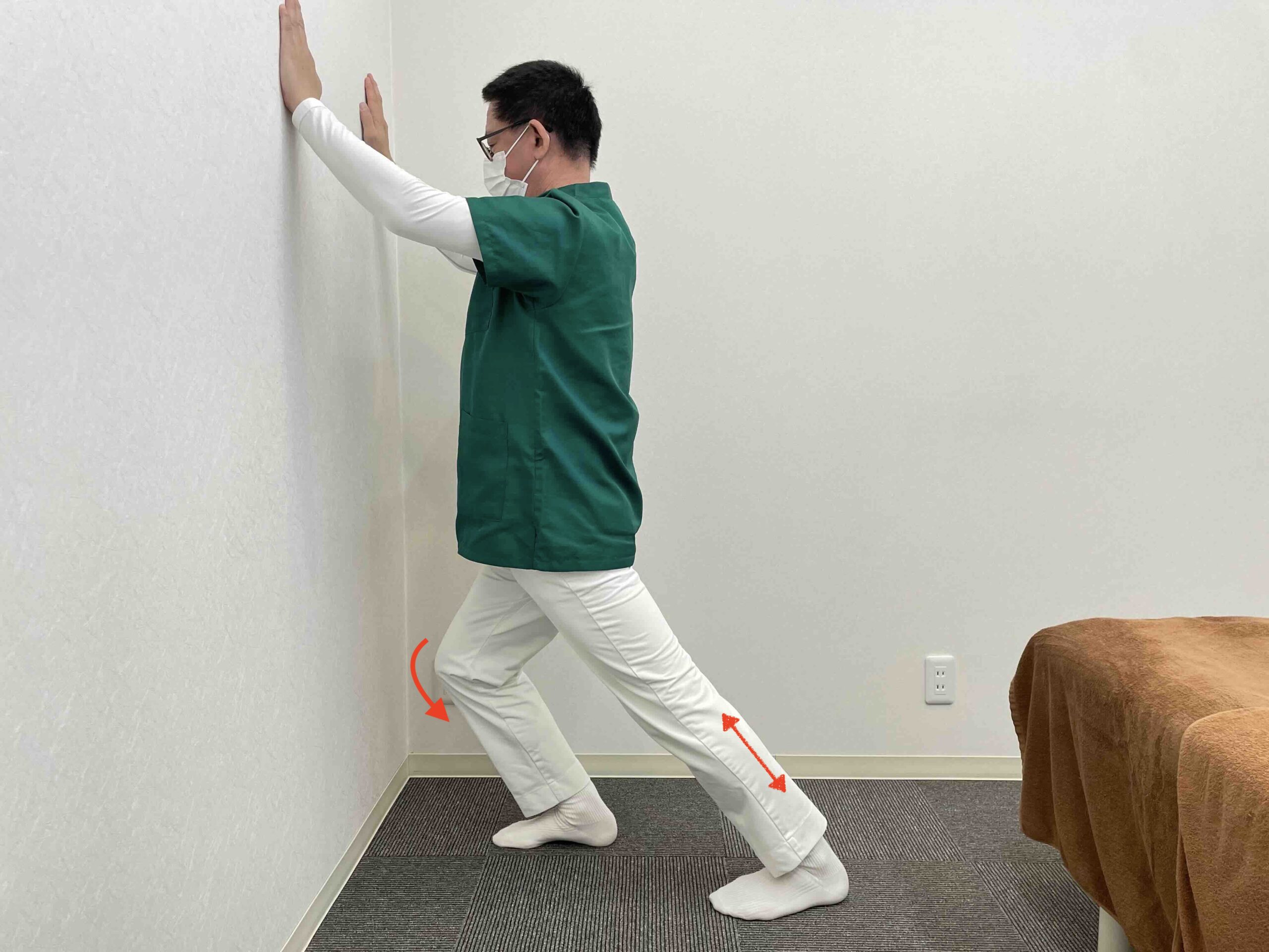 壁に手をつき、伸ばしたい足を後ろへ伸ばし、ひざも伸ばす